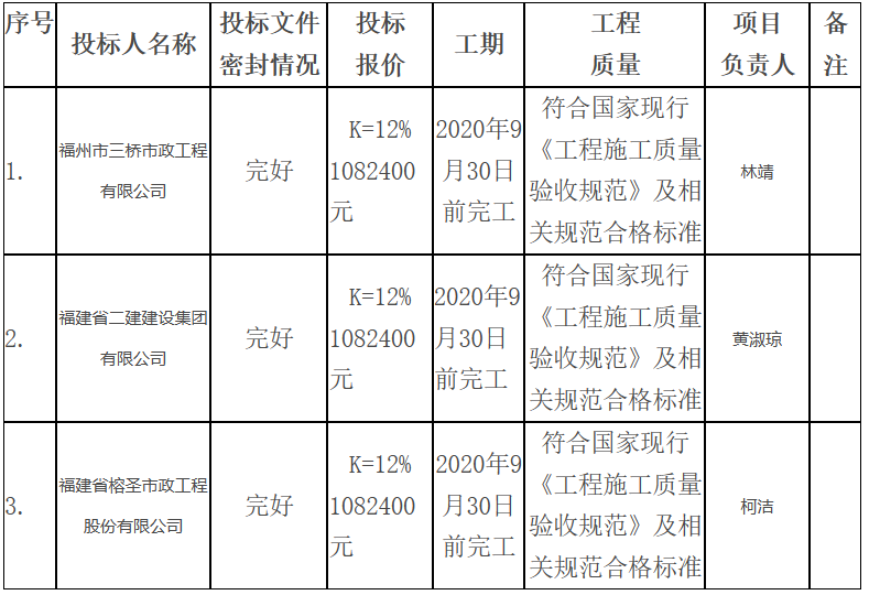 本招标项目于2020年6月23日14:00时在福建法润工程咨询有限公司(福州市鼓楼区冶山路福建商业大厦10层1006室)开标,已由评标委员会评审完毕,现将中标候选人结果公示如下: