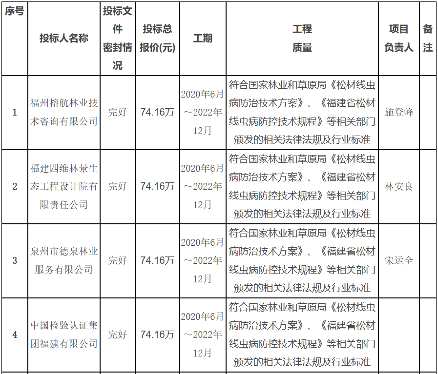 工程质量:符合国家林业和草原局《松材线虫病防治技术方案》、《福建省松材线虫病防控技术规程》等相关部门颁发的相关法律法规及行业标准